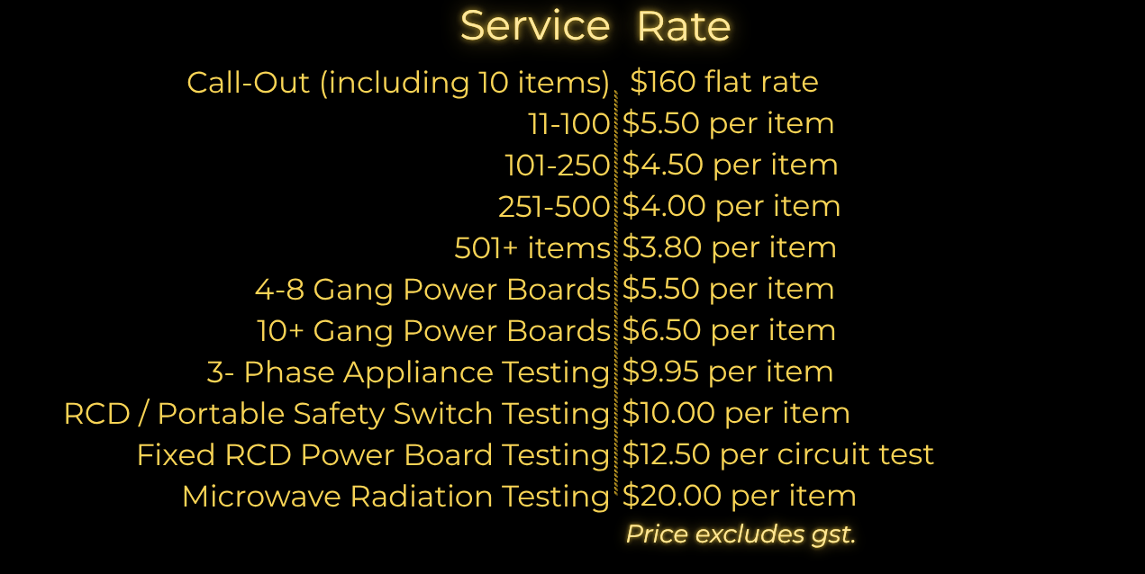 For warehouses, workshops, industrial sites, or other high-risk environments (e.g. dirty, dusty, wet, or hazardous areas), pricing may vary. These environments require additional time, specialised safety procedures, and protective equipment to complete testing safely and in compliance with WHS standards.
